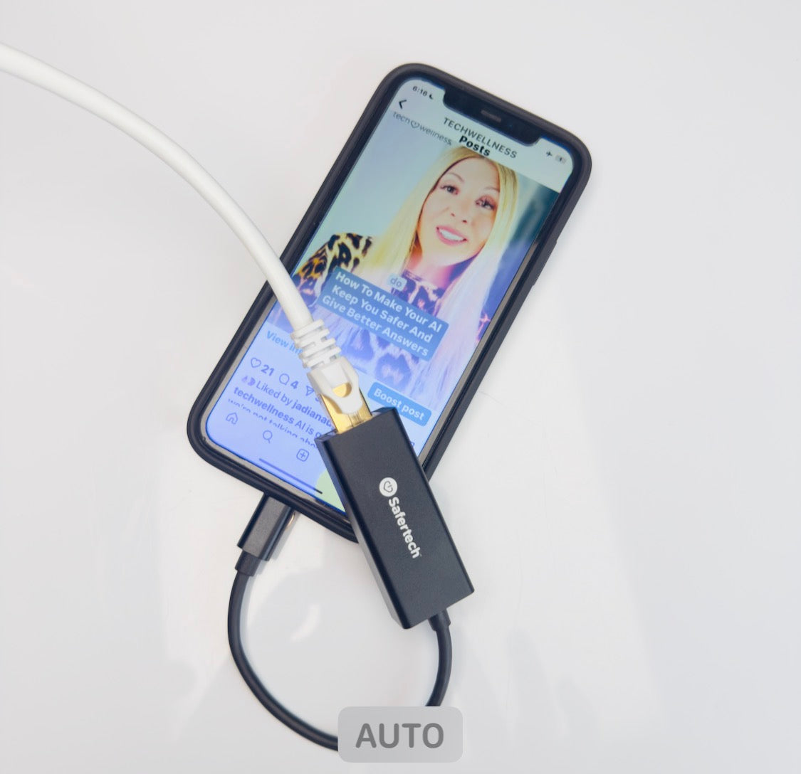 Our Lightning to Ethernet Wired Dongle lets you avoid WiFi EMF and use your iPhone or iPad directly connected to the internet - load videos, shopping pages — everything online super fast!